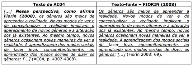 No fragmento a seguir, quando confrontamos o dizer do produtor com o dizer expresso no texto-fonte de Fiorin, constatamos que o enunciado de AC04 configura, em sua essência, uma “repetição do uso da linguagem”.