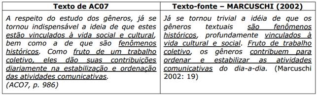 Em (4), o dizer do produtor do AC07 expressa uma posição do linguista Marcuschi sobre gêneros (textuais) em relação à qual ele - o produtor - opera reformulações mínimas no plano da forma, sem, porém, alterar o plano do sentido, no que pode ser caracterizado como um caso de patchwriting, nos termos como concebem Pecorari (2008) e Howard (1995).