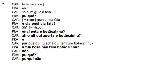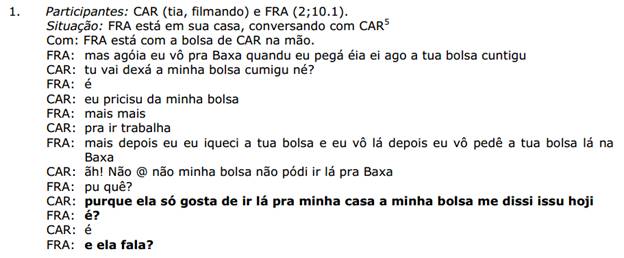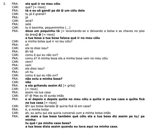 Tal condição de diálogo a criança concede às bolsas: “ah mais a tua bosa também qué cólu ela a tua bosa diz assim pa tu/ pa minha: tu qué i pa minha casa bosa? A tua bosa dizia assim quandu eu tava aqui na minha casa”. A análise operada em ato permite à criança, na significância do discurso, não somente compreender que a bolsa pode falar, como também produzir um diálogo entre as bolsas. Com isso, FRA atualiza um segundo nível de enunciação em uma espécie de metassemântica, que se se realiza sobre a semântica da enunciação, com a criação de uma nova realidade de discurso no interior de seu discurso.