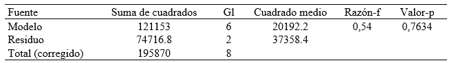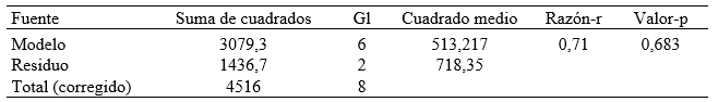 Los análisis de varianza para los modelos de relación lineal entre las variables muestran que, en el modelo, ninguna de las variables es significativa (valor-p > 0,05)(tabla 3).