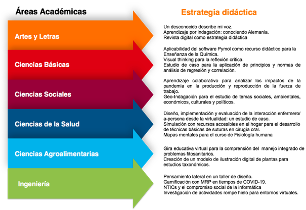 A modo de ejemplo, en la figura 2 se representan algunas de las innovaciones didácticas desarrolladas por el profesorado como parte del proceso formativo. Como se puede observar, estas acciones promovieron oportunidades de aprendizaje en diversas áreas académicas de la universidad, incluso en algunas donde tradicionalmente se encuentra más resistencia a nuevos abordajes formativos.