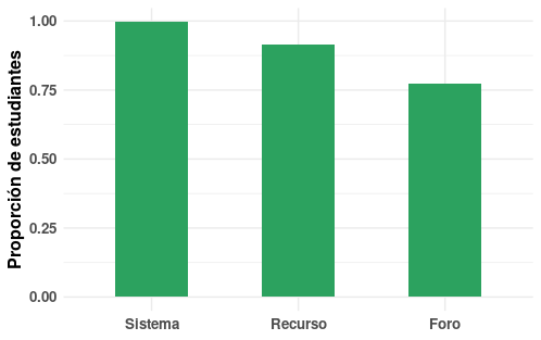 Figura 1:  Proporción de estudiantes con registros de actividad por componente del curso (N total = 825). Sistema: ingresar al curso. Recurso: acceso a materiales publicados por los docentes. Foro: acceso a alguno de los foros de consulta, ya sea para crear preguntas, responder existentes o visualizar las existentes.
