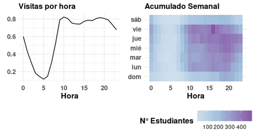 Figura 2:  A) Actividad de estudiantes por hora del día. B) Actividad de estudiantes discriminada por día de la semana y hora. A mayor intensidad de color, mayor cantidad de estudiantes activos en ese día a esa hora.