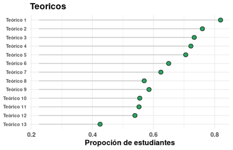Figura 3:  Proporción de estudiantes que acceden a cada teórico semanal. Luego de los teóricos 5 y 13, tuvieron fecha las evaluaciones parciales.