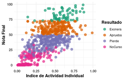 Figura 5:  Diagrama de dispersión entre la nota final (desempeño) y el índice de actividad individual, coloreados según categoría del resultado final obtenido en el curso.