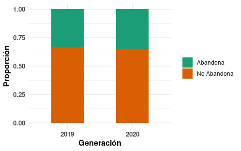 Figura 6:  Barras proporcionales de las categorías abandona y no abandona para los años 2019 y 2020.