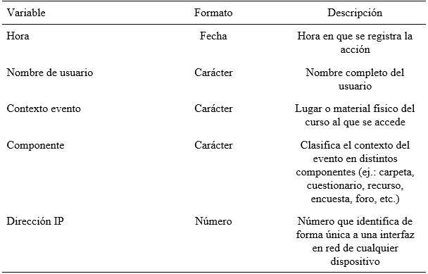 El registro de actividades de EVA es la fuente de información más completa y detallada de las actividades que realizan los estudiantes dentro de un curso. Es un registro de cada acción (“click”) que un usuario hace dentro de la plataforma. Además de la información de usuario y el ítem al cual accedió, se registran la fecha, la hora, el tipo de evento y su contexto, así como la dirección de IP (tabla 1). Una de las desventajas que presentan estos registros es que muchos de los campos dependen de la flexibilidad con que fueron llenados cuando el material se subió a la plataforma (ej.: nombres, títulos, secciones, recursos), por lo tanto no existe un criterio uniformizado.