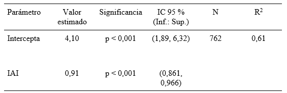 Resultados de la recta de regresión ajustada. IC 95 %: intervalo de confianza de los parámetros estimados con un nivel de significancia de 95 %. N: cantidad total de datos. R2: coeficiente de determinación.