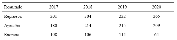 Para comparar el desempeño de la generación 2020 con el de generaciones previas (2017, 2018 y 2019), se clasificó a los estudiantes en tres categorías: exonera (examen), aprueba (curso) y pierde (curso), de acuerdo a la calificación obtenida (sin considerar estudiantes que abandonaron el curso) y según año. Se realizó un análisis de frecuencias de chi cuadrado (alfa = 0,05) para determinar si existieron diferencias en la proporción de estudiantes que alcanzaron un nivel de aprobación según el año.