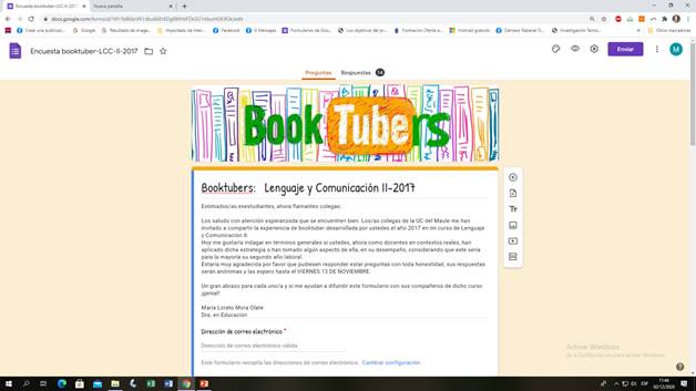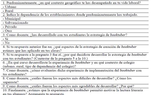 Por su parte, para el segundo momento que refiere a la experiencia en el ejercicio profesional pandémico del uso del booktuber, las preguntas de la encuesta 2 fueron las siguientes: