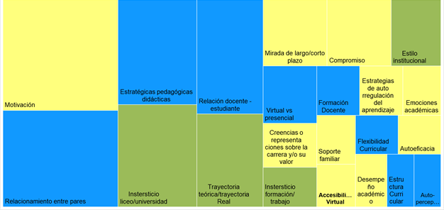 Figura 1:  Nota: Las Mosaico de perspectivas estudiantiles sobre significados vinculados a la permanencia universitaria categorías en amarillo corresponden al nivel sujeto, en azul al nivel institucional y en verde las emergentes.