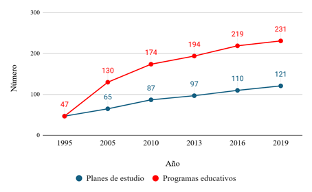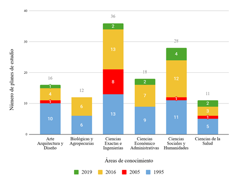 En 2014, al iniciar la administración, 40 de los 97 planes de estudio existentes tenían más de 10 años sin actualizarse, cuando lo ideal es que se actualicen cada cuatro años. Al finalizar la administración, 29 de 121 planes tenían más de 10 años de actualizados (figura 1). Es decir, pasamos de 59 % a 76 % el total de planes de estudio actualizados.