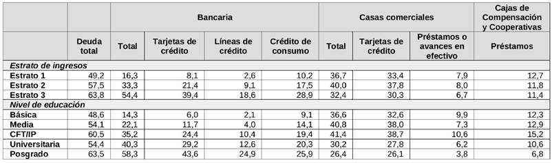 Tabla 1 Tenencia de deudas, estratos de ingresos y niveles educativos de la población