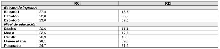 Lo anterior expresa una proporción decreciente de la incidencia de la deuda en los ingresos efectivos, en lo que se refiere a los estratos consultados, cuestión que se matiza, sin embargo, al revisar la incidencia de los niveles educativos. Este aspecto también se deduce de las razones de endeudamiento reflejados en la EFH 2017, que permiten identificar la ratio de la carga financiera sobre ingreso (RCI, que expresa la proporción del ingreso monetario mensual del hogar que se destina al pago de la deuda total mensual) y la ratio de deuda sobre ingreso (RDI, o apalancamiento, que expresa cuántas veces representa la deuda total de los hogares sobre su ingreso anual). Estos datos dan cuenta de lo siguiente (Banco Central, 2018)(Tabla 5):