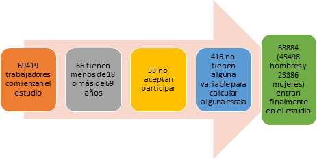 Se realizó un estudio descriptivo y transversal en 68884 trabajadores españoles (45498 hombres y 23386 mujeres) con obesidad de los sectores primario, secundario y terciario en el periodo comprendido entre enero del año 2019 y junio del año 2020. Los trabajadores fueron seleccionados entre los que acudieron a los reconocimientos medicos laborales obligatorios realizados en las diferentes empresas participantes en el estudio.