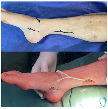 Paciente en decúbito dorsal, uso de manguito neumático, se des inserta el cabo distal del tendón del TP mediante un abordaje medial. Se libera el mismo en su trayecto, se hemisecciona para obtener dos cabos distales y se tuneliza hacia el dorso del pie (figura 1). Mediante un abordaje dorsal del pie se identifican los tendones afectados de la logia anterolateral: el tendón del TA, el tendón del extensor del hallux y los tendones de los extensores comunes de los dedos (figura 2) en vistas a realizar la tenodesis de un hemi-tendón del TP al tendón del TA mientras que el segundo cabo distal lo hace con extensor del hallux y a los extensores de los dedos. Con el pie en posición de dorsiflexión máxima, se lleva a cabo la tenodesis según la técnica de Pulveraft, caracterizada por la sutura del hemi-tendón donante mediante la tunelización del tendón receptor (figura 2). El cierre se realiza con puntos separados que se retiran en consulta a los 30 días.