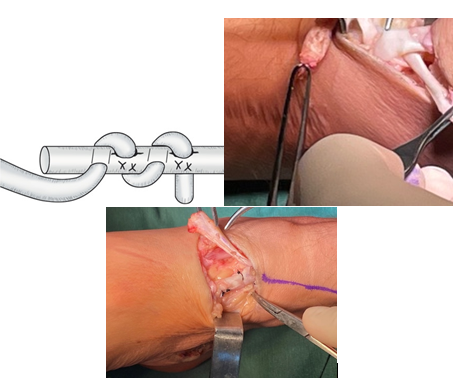 Respecto a la fijación del tendón han sido descritas distintas variantes, tornillos sobre los huesos del tarso, anclas o la sutura tendón-tendón como en este caso. Con implantes es más difícil ajustar la tensión y no se logra una acción sobre la posición y extensión de los dedos. La fijación tendón-tendón, es técnicamente más simple, requiere menos disección y se logra mejor distribución de la fuerza y una función más fisiológica 18.