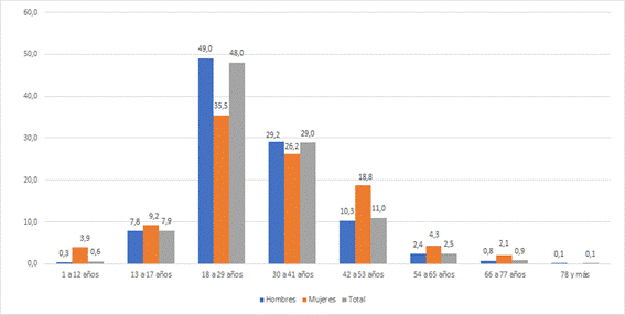 Figura 1: Distribución de HAF por tramo etario y sexo atendidos en ASSE Montevideo entre 2020 y 2023 (porcentaje)
