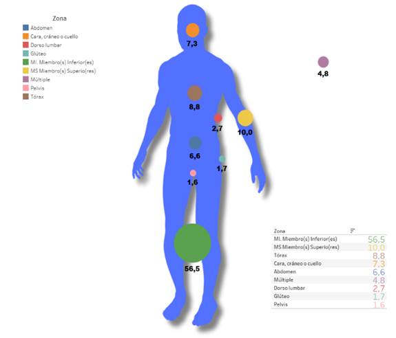 Las HAF en los miembros inferiores del cuerpo concentran poco más de la mitad de los casos, 60 de cada 100 HAF acontecieron en pies, rodillas, tibias, pantorrillas, entre otros. Seguidamente, 10 de cada 100 casos acontecieron en alguno de los miembros superiores: antebrazos, codos, hombros, entre otros.