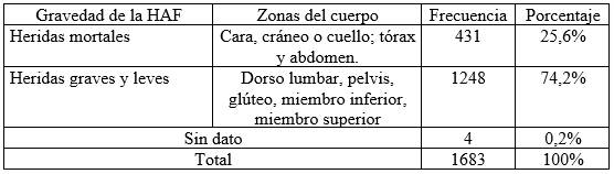 Importa tener presente que se decidió crear dos categorías -y no las tres categorías en el diagrama de Bircher-0 al no contar con información completa sobre las heridas leves (pies, manos y otras extremidades del cuerpo). En el caso de las HAF múltiples se prioriza la zona corporal de mayor riesgo vital. Por ejemplo, si las HAF acontecieron en la zona del tórax y el glúteo del paciente este caso se clasificó como “heridas mortales”.