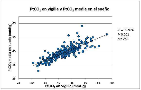 La PtCO2 media de vigilia de los 242 pacientes (42.9 ± 4.9) (K-S D = 0.053) mostró una correlación lineal significativa con la PtCO2 media en el sueño (r2 = 0.6974, p<0.001) (K-S D = 0.065) (Fig. 1).