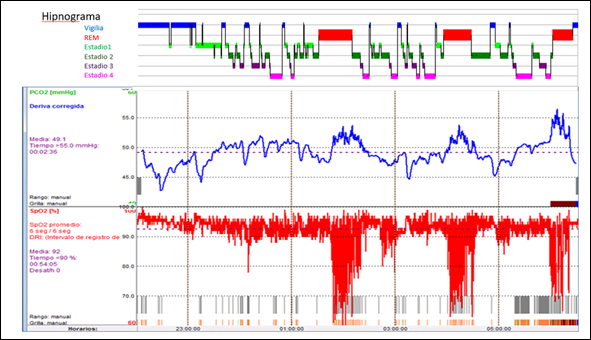 Panel Superior: hipnograma. Vigilia y estadios de sueño S1, S2, S3, S4 y REM indicados por bandas de colores. Panel medio: registro de PtCO2. Se observa aumento lento y progresivo de PtCO2 durante estadios de sueño 3 y 4. Los valores máximos de PtCO2 son simultáneos a los episodios de hipoxia-reoxigenación inducidos por apneas, durante sueño REM. PtCO2 máx = 56mmHg. TA48≥20% = 68%; TA50≥20% = 37%. Panel inferior: registro de SpO2.