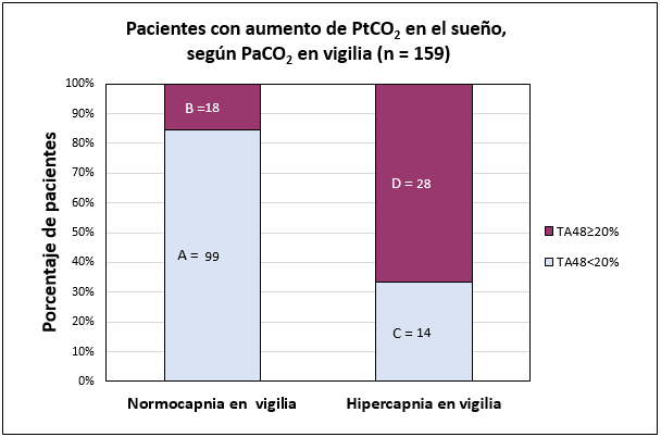 Los datos de los pacientes según PaCO2 de vigilia se muestran en la Figura 4. El aumento de PtCO2 durante el sueño, medido por TA48 se observó en 46 (Grupo B+D, 28.9%) de 159 pacientes. Estuvo presente en 28 (Grupo D, 66.7%,) de 46 pacientes con hipercapnia en vigilia (Grupo D+C). Sólo se presentó en 18 (Grupo B, 15.4%,) de 117 pacientes con normocapnia en vigilia (Grupo A+B) (x2 = 39.53, p<0.0001).