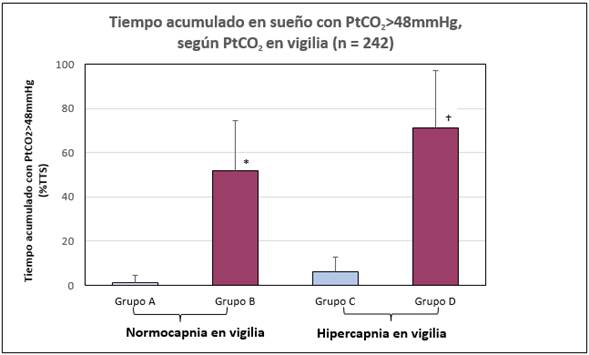 El aumento de PtCO2 durante el sueño, medido por TA48≥20%, se observó en 57 (Grupos B+D, 23.6%) de 242 pacientes. Se observó el aumento en 38 (Grupo D, 60.3%) de 63 pacientes con hipercapnia en vigilia (Grupo C+D). Sólo se encontró en 19 (Grupo B, 11.9%) de 179 (Grupos A+B) pacientes con normocapnia en vigilia (x2 =63.93 p<0.0001).