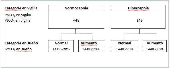 Los pacientes fueron divididos en las siguientes categorías, según los datos PaCO2 en vigilia y de de PtCO2 y en vigilia: normocapnia (PCO2 <45 mmHg) o hipercapnia (PCO2 ≥ 45mmHg). Estas categorías fueron a su vez subdivididas según si el tiempo acumulado con PtCO2 ≥ 48mhg, fuera menor o mayor a 20% del registro (Tabla 1).