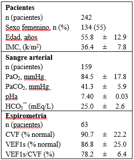 IMC: índice de masa corporal (k/talla2); n: número de pacientes. PaO2: presión parcial de oxígeno en sangre arterial (mmHg). PaCO2: presión parcial de anhídrido carbónico en sangre arterial (mmHg). HCO3¯: bicarbonato plasmático (miliequivalentes por litro). CVF: Capacidad vital forzada (% del normal). VEF1s: Volumen espirado en el primer segundo % del normal. Valores expresados en media ± desvío estándar.
