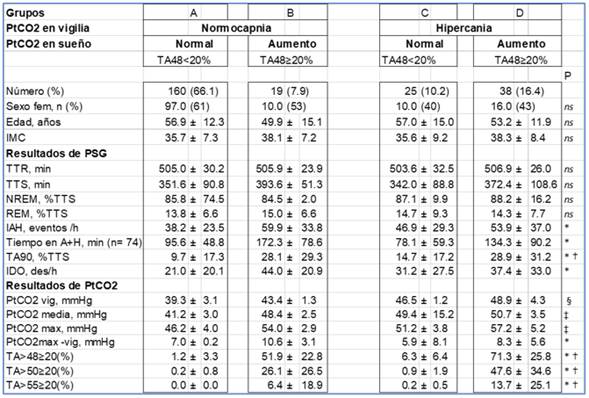 La PtCO2 media y máxima fueron mayores cuando se comparó el grupo B y D vs A. La diferencia entre la PtCO2 máxima y la de vigilia fue mayor en el grupo B vs A. El tiempo en apnea+hipopnea se encontró significativamente aumentado en el grupo B vs A. El tiempo en hipoxia medido por TA90% fue significativamente mayor en los grupos con aumento B vs A y D vs C. El IDO fue mayor en grupo B vs A.