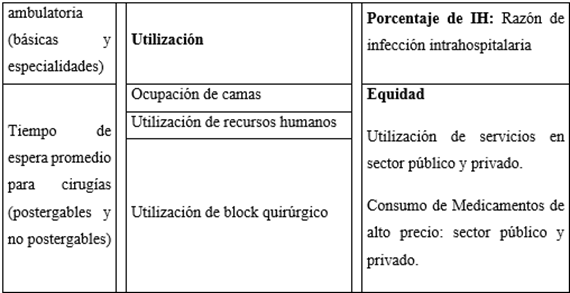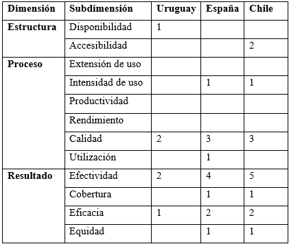 Del total de indicadores identificados en los tres países y en las tres dimensiones, la dimensión estructura es la que se encuentra completa en España y Chile, en el caso de Uruguay no presenta el indicador de accesibilidad elegido (tiempos de espera para la realización de cirugías), este indicador se encuentran regulado por una normativa (Decreto 359/2007) (17) pero las listas de espera quirúrgicas18 o los tiempos no se encuentran disponibles.
