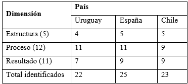 Respecto a los indicadores de proceso tanto Uruguay como España presentan 11 de 12 indicadores y Chile 9. La dimensión de resultados es la que cuenta con el menor número de indicadores en los tres países, siendo Uruguay el que presenta el menor número de indicadores (Ver tabla 1).