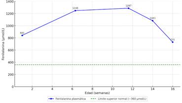 Tras la confirmación de fenilcetonuria clásica se gestionó referencia a un centro especializado; sin embargo, la demora en la provisión de la fórmula libre de Phe prolongó la lactancia materna exclusiva durante seis semanas adicionales, sin intervención dietética específica, lo cual favoreció la persistencia de niveles plasmáticos elevados con niveles de fenilalanina de 1248 µmol/L a las 11 semanas 4 días 1287 µmol/L. La suplementación con fórmula metabólica (5 g/60 mL, 5 tomas/día durante 15 días; luego 10 g/180 mL cada 4 h) inició a la semana 14 semanas de vida, con descenso de fenilalanina a 1 082,5 µmol/L y posteriormente a 731,5 µmol/L a la semana 16 de vida, descritos en elgráfico 1.