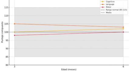 Gráfico 2: Seguimiento del neurodesarrollo a los 3 y 6 meses utilizando los puntajes compuestos de la Escala Bayley-III. Se observa que todos los dominios evaluados se mantienen dentro del rango normal (85-115), lo que indica un desarrollo adecuado hasta el momento.