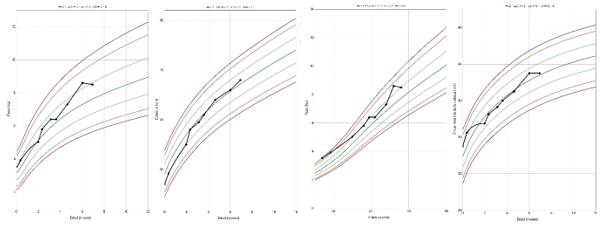 Gráfico 3: Las curvas de crecimiento según la OMS muestran un crecimiento adecuado, con peso, talla, peso para la talla y perímetro cefálico, entre los valores normales (Z=0 a +1), sin indicios de desnutrición ni sobrepeso. Su desarrollo es armónico y acorde a su edad y estatura.