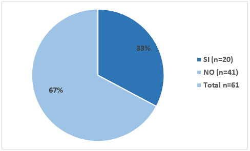 En las 61 mujeres participantes el 32,8% (20/61) ya venían realizando algún tipo de ejercicio físico desde antes de quedar embarazadas, mientras que 67% (41/61) no practicaban ejercicio pre gestacional.