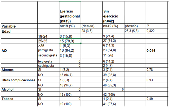 Se invitó a participar a 159 embarazadas de las cuales 61 completaron el formulario, expresando su deseo de incorporarse al plan de actividad física programada (Tabla 1). La media de edad para el grupo que realizó ejercicio en él embarazo fue de 28 (± 3,8) años y para el grupo sin ejercicio fue de 28,3 (±5,3) años. Un 64 % (39/61) cursaba su primer embarazo en ambos grupos, la mayor participación fue en el grupo de ejercicio (valor p 0.016) y las multíparas eran quienes menos participaron. Un 11,5% (7/61) reportó antecedentes obstétricos, con un 6,5% (4/61) de abortos espontáneos y un 4,9 % (3/61) de otras patologías durante el embarazo anterior, sin una diferencia estadísticamente significa entre ambos grupos.