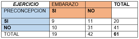 Tabla 2: Relación entre la práctica de ejercicio previo y durante el embarazo