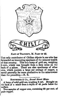 Por una parte, el medio oficial de difusión de la Exposición, el Official Catalogue of the Great Exhibition of the Works of Industry of all Nations, (fig. 12) indica que Chile exhibió un trozo de oro con un peso de 335 libras. Por otra, en the Official Descriptive and Illustrated Catalogue of the Great Exhibition of the Works of Industry of all Nations, se transmite una información diferente. Chile también presentó dos muestras de cobre con una pureza del 62%, un peso de 250 libras, y junto a esta, una pieza de plata con 154 libras de peso. Las variaciones de información contenida en los ambos catálogos oficiales del evento, omiten de la historia la identidad de los expositores y la procedencia de los objetos, es decir, el territorio nacional.