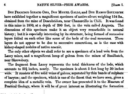Mientras otros registros del evento, como el catálogo de premiación, publicado en 1852, Reports of the Juries, confirman la participación de los chilenos junto a la multinacional inglesa Schneider & Co, y además agregan la información respecto del origen y las zonas de extracción de las piezas exhibidas. Este catálogo declara que la pieza de oro fue extraída de la Mina Madre de Dios, cercana a Ovalle, y las dos piezas de cobre eran de la mina de Tamaya (fig.13); mientras que la gran muestra de plata provenía de la Descubridora, distrito de Chañarcillo (fig.14). Finalmente, aunque con un discurso que no relataba la historia completa del territorio exhibido, los representantes de la elite y la empresa inglesa, en una vitrina acristalada, - proyectada sobre el pasillo principal -, exhibían los objetos devenidos del territorio de la minería, que al ser puesto en un pudio y tras un vidrio; estos pasarían de ser ‘objetos simples’, a ser parte de un ‘imaginario de nación’, "objetos símbolos del status obtenido” (Hobsbawn 2010), tras los 30 años de progreso.