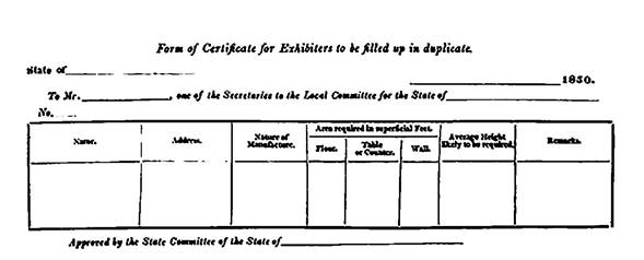 Figura 15: talón de inscripción de: Official Descriptive and Illustrated Catalogue of The Great Exhibition of The Works of Industry of all Nations. apéndice II, página 12. Contenido: Imagen del talón de inscripción de la exhibición. Detalla nombre del exhibidor, localidad, tipo de objetos, tipo de exhibición, detalle objetos, entre otros requerimientos.