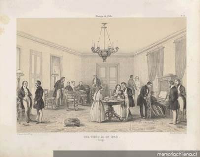 Para 1835 Chile presentaba una población cercana al millón de habitantes y se concentraba en el valle central, entre Santiago y Concepción, siendo la mayor parte perteneciente al campesinado. Este grupo vivió durante el siglo XIX en condiciones de escasez y analfabetismo generalizado que le impedía darse cuenta de su contexto social, es decir, la pobreza también se extendía a los ámbitos sociales y culturales (fig. 2). Por otra parte, la aristocracia, presentaba una vida rústica pero acomodada, sin embargo, considerablemente menos lujosa que otros de sus pares en el territorio de Latinoamérica. Comentarios de viajeros evidenciaban las contradicciones entre el lujo y lo rudimentario de la época, entre ellos Eduard Poeppig, que fijó su mirada en “el piso de simple tierra (ladrillo) de la mejor sala de recepción está cubierto por ricas alfombras inglesas; una elegante lámpara de araña, de cristales, está colgada de una tosca viga (…).” (Poeppig, 1960, pág. 115) (fig. 3).