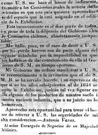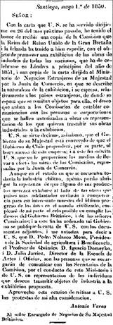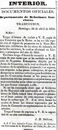 La información de la invitación a la Exposición de Londres y sus requerimientos, fue publicada en el diario nacional la Tribuna de Santiago, en 1850.