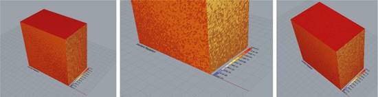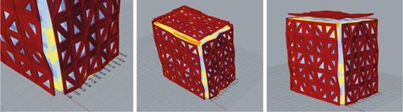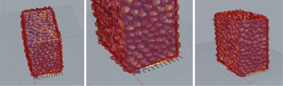 En el modelo analizado, los patrones Voronoi se perforaron proyectándose telescópicamente hacia el exterior, generando elementos tridimensionales que sobresalían del prisma, evocando la forma orgánica de los corales marinos. Este diseño, adaptado a las condiciones climáticas específicas, combina funcionalidad y estética, ofreciendo una solución flexible y altamente eficiente. Esta capacidad de adaptación posiciona a los patrones Voronoi como una solución clave para abordar retos arquitectónicos y ambientales en el marco del diseño sostenible.