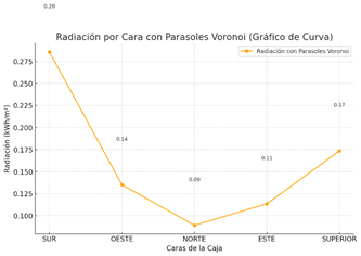 Figura 12: Radiación por Cara: Distribución de la radiación en cada cara de la caja utilizando los Parasoles Voronoi.