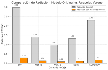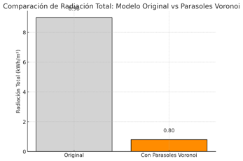 Figura 13: Comparación de Radiación: Gráfico que muestra la reducción de radiación tras aplicar los Parasoles Voronoi