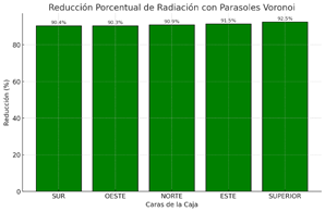 Figura 14: Reducción Porcentual de Radiación: Reducción de radiación en cada cara con los Parasoles Voronoi. Muestra claramente cómo cada cara experimenta una disminución significativa, con valores superiores al 90% en todas las caras.