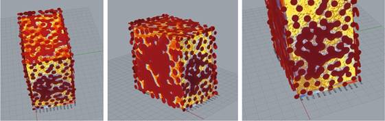En el modelo, los patrones Metaball se emplearon para diseñar superficies microperforadas de sombreado sobre un prisma arquitectónico, logrando un equilibrio entre estética y funcionalidad. Estos sistemas responden dinámicamente a la radiación solar, optimizando el confort térmico mediante sombreado efectivo, ventilación natural y difusión de la luz. El diseño paramétrico permite personalizar la densidad y distribución de las estructuras Metaball, consolidándolas como una solución clave en el diseño sostenible, capaz de abordar retos climáticos y energéticos contemporáneos.