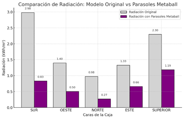 Figura 18: Comparación de Radiación: Gráfico que muestra la reducción de radiación tras aplicar los Parasoles Metaball, destacando la cara SUPERIOR con niveles aún elevados.